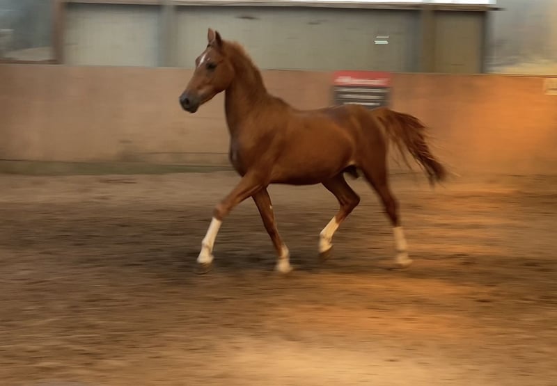Bright Red – Perfectly Matches a Great Character! Harrytani is a German Riding Pony with three very good basic gaits, a strong hindquarters, and plenty of scope. His potential for dressage is of high quality. Harrytani is very human-oriented and learns quickly – he aims to please and has a good attitude. He is currently in preparation for licensing and can be presented by us at the spring licensing. He is sold as a stallion but could also be gelded here. His full brother has competed twice at the European Championships. The dam has a successful sport career herself. For more information, please call 01736782519.