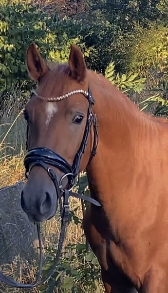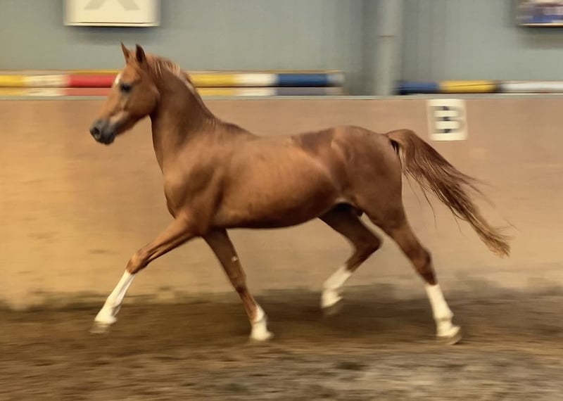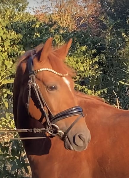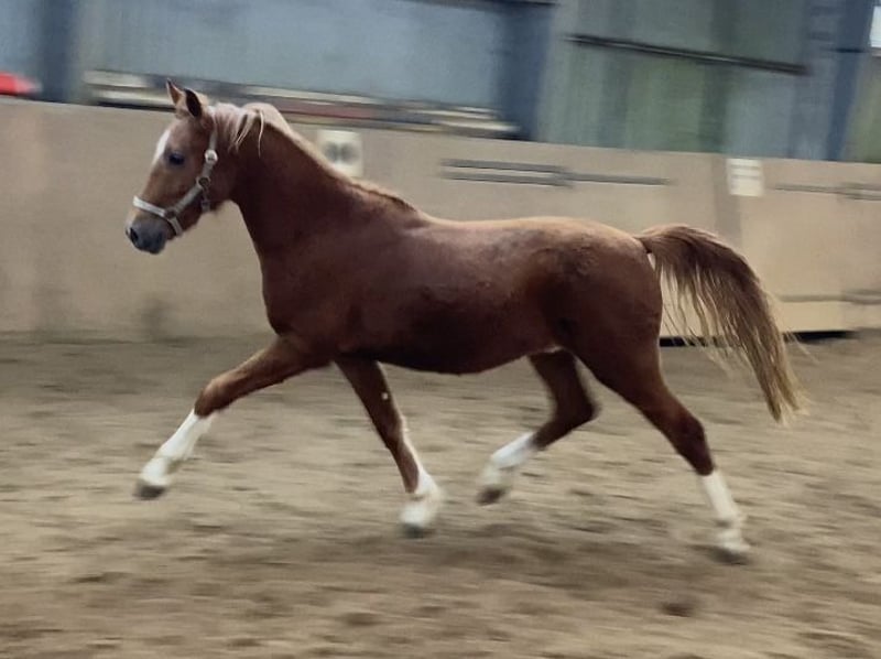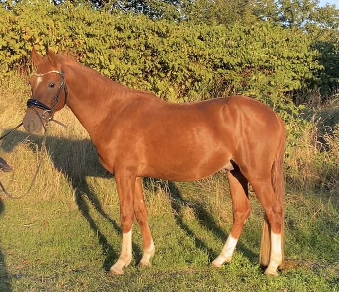 Leuchtendes Rot - trifft super Charakter ! Harrytani ist ein Deutsches Reitpony mit drei sehr guten Grundgangarten , er hat eine tolle Hinterhand und viel Raumgriff . Sein Potential für die Dressur ist qualitativ wertvoll . Harrytani ist sehr menschenbezogen und lernt schnell - er möchte sehr gefallen und hat eine gute Einstellung , Er befindet sich in Körvorbereitung und kann von uns zur Frühjahrkörung vorgestellt werden . Er wird als Hengst verkauft , könnte aber auch hier kastriert werden . Der Vollbruder ist zweimaliger Euro Teilnehmer . Mutter selbst ist erfolgreich im Sport gegangen . Weitere Infos -01736782519