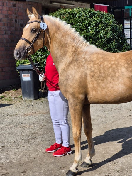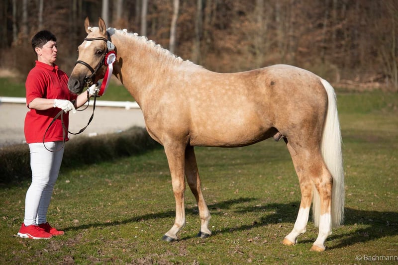 Guillaume è nato il 17 giugno 2022. Nonostante la sua giovane età, colpisce già per la sua sufficiente espressione da stallone. È alto e raggiungerà la sua altezza finale. Inoltre, è costruito correttamente e ha 3 andature di base superiori alla media, che migliorano di giorno in giorno. Ha ricevuto il premio d'oro alla mostra dei puledri, dove le sue andature di base e la sua tipologia sono state particolarmente enfatizzate. La sua fattrice Normandie ha completato con successo il suo SLP e ha ottenuto il titolo di premio statale. La sorella piena ha avuto successo fino al livello avanzato di dressage in America. La linea della madre ha prodotto pony sportivi di grande successo. La nonna Visa è sorella piena degli stalloni Zhivago (S dressage) Sydney e Santiago e dell'eccezionale cavalla Veronika. Video su richiesta. Le informazioni fornite sono una descrizione non vincolante e non rappresentano caratteristiche garantite. Il venditore non è responsabile di errori, errori di inserimento e di trasmissione dei dati.