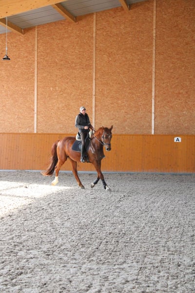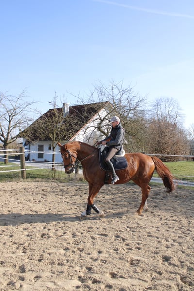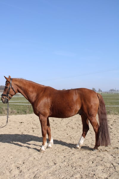 Due to a reduction in our herd, we unfortunately have to part ways with our chestnut gelding. Danny is a very gentle and affectionate gelding. He is very relaxed in handling. Thanks to his excellent pedigree, Danny possesses three outstanding basic gaits with a lot of impulsion. At the start of training, he may need some time to warm up, but then riding him is a real pleasure. He is neither a bucker nor a rearer. The well-being of the horse comes before price. For more information, please contact me at 0151-52583628.