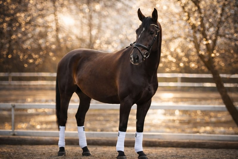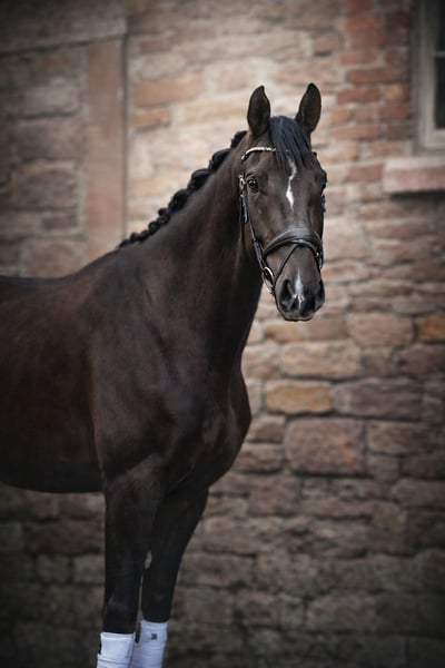 Sir Chic GS a été élevé au Schafhof à Kronberg im Taunus, où il a principalement passé sa période de poulain en pâture sur de vastes prairies. Récemment, le hongre a été placé à la clinique équine de Großwallstadt, et dès ses débuts en tant que jeune cheval, il n’a montré aucun signe de comportement de mâle dominant, ce qui souligne son caractère équilibré et facile. Ce jeune hongre, appelé « Sammy » dans l’écurie, est actuellement confié à une préparatrice qui l’introduit doucement et de manière adaptée à son âge aux bases d’un futur cheval de sport. Il se montre très volontaire à l’apprentissage, sage et coopératif. Il est déjà très bien manipulé en licol, se laisse facilement attacher et brosser, et connaît le travail avec la selle. Il accepte également de monter dans le van de manière calme et fiable. Il convient de souligner la qualité exceptionnelle de sa lignée. Sir Chic GS descend de Sir Donnerhall, issu d’une mère par Totilas, réunissant ainsi deux des étalons de dressage les plus influents de la modernité dans l’élevage du sang chaud. Sir Donnerhall est reconnu pour sa facilité de dressage, son elasticité et sa qualité de mouvement exceptionnelle, tandis que Totilas, légende du dressage mondial, est célèbre pour son expression, sa dynamique et ses performances sportives de haut niveau. Ce patrimoine génétique remarquable se manifeste déjà dans les mouvements de Sir Chic GS. Il possède des allures de base supérieures à la moyenne, avec beaucoup de tact, d’impulsion et d’équilibre naturel. Par ailleurs, il reste constamment attentif dans de nouvelles situations, tout en étant fiable et calme. Grâce à sa lignée prestigieuse, à son caractère sincère et à son potentiel de mouvement, Sir Chic GS dispose de toutes les qualités nécessaires pour évoluer à terme en un cheval de dressage performant en compétition.