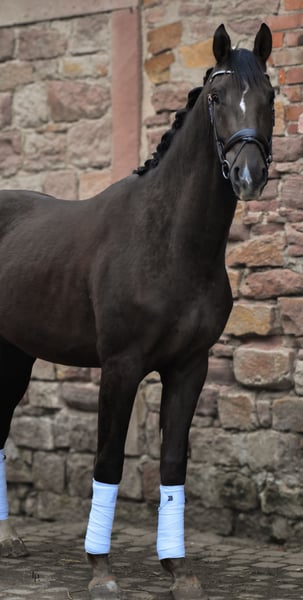Sir Chic GS wurde auf dem Schafhof in Kronberg im Taunus gezogen und durfte seine Jungpferdezeit überwiegend auf großzügigen Koppeln verbringen. Der Wallach wurde vor Kurzem in der Pferdeklinik Großwallstadt gelegt und zeigte bereits als Hengst keinerlei Hengstmanieren, was seinen ausgeglichenen und unkomplizierten Charakter unterstreicht. Der junge Wallach, der im Stall „Sammy“ genannt wird, befindet sich aktuell bei einer Bereiterin, bei der er behutsam und altersgerecht an die Grundlagen eines zukünftigen Reitpferdes herangeführt wird. Dabei präsentiert er sich sehr lernwillig, brav und kooperativ. Er ist bereits sehr gut halfterführig, lässt sich problemlos anbinden und putzen und ist mit dem Sattel vertraut. Auch das Verladen auf den Anhänger gelingt ihm ruhig und zuverlässig. Besonders hervorzuheben ist seine hochkarätige Abstammung. Sir Chic GS stammt ab von Sir Donnerhall aus einer Totilas-Mutter und vereint damit zwei der einflussreichsten Dressurvererber der modernen Warmblutzucht. Sir Donnerhall steht für Rittigkeit, Elastizität und außergewöhnliche Bewegungsqualität, während Totilas als eine der prägendsten Dressurlegenden weltweit für Ausdruck, Dynamik und sportliche Höchstleistungen bekannt ist. Diese hervorragende genetische Grundlage zeigt sich bereits jetzt in den Bewegungen von Sir Chic GS. Er verfügt über überdurchschnittlich gute Grundgangarten mit viel Takt, Schwung und natürlicher Balance. Zudem präsentiert er sich in neuen Situationen stets aufmerksam, dabei jedoch zuverlässig und gelassen. Mit seiner erstklassigen Abstammung, seinem ehrlichen Charakter und seinem Bewegungspotenzial bringt Sir Chic GS beste Voraussetzungen mit, sich perspektivisch zu einem erfolgreichen Dressurpferd im Turniersport zu entwickeln.