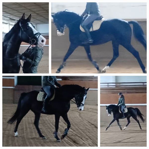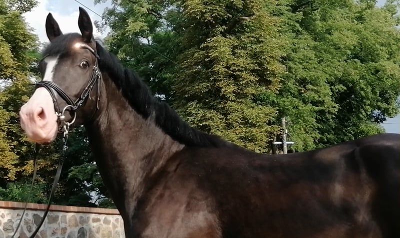 Our Bugatti SB is a real eye-catcher - beautiful, striking, and guaranteed to be memorable! Bugatti was born with us, raised around people, and was sent for professional training to the Brandenburg State Stud in Neustadt/Dosse. There, he was gently and age-appropriately started under saddle at the end of 2023. He is a little overachiever, absolutely uncomplicated, and impresses with his relaxed demeanor. He demonstrates three very good basic gaits and has already completed a few small jumps in the free jumping arena, showing great awareness throughout. Since he was born and raised on a farm, machines such as tractors, yard loaders, mini excavators, as well as leaf blowers and circular saws are part of his everyday life. He is open-minded and observes the happenings with complete calmness. Handling mares is not a problem - in the stable, his box was situated between two mares, and his mother (with foal) was directly opposite. He is currently in a mixed stable with individual boxes. His father, the Neustadt stallion Blanc Pain/T., has been successful in dressage at the S level. In 2021, Blanc Pain was awarded the title of Elite Candidate by the Trakehner Association due to his above-average performance in sports and the quality of his first two foal crops! In 2024, a son of Blanc Pain was named the champion stallion at the Trakehner licensing in Neumünster! The full brother of Bugatti's mother, "Lord Capri SB," has already achieved his first S-level placements in dressage with his owner, which we are very proud of. Due to his presence and very good basic gaits, we can also imagine Bugatti excelling in driving sports, whether in single harness or as part of a pair.