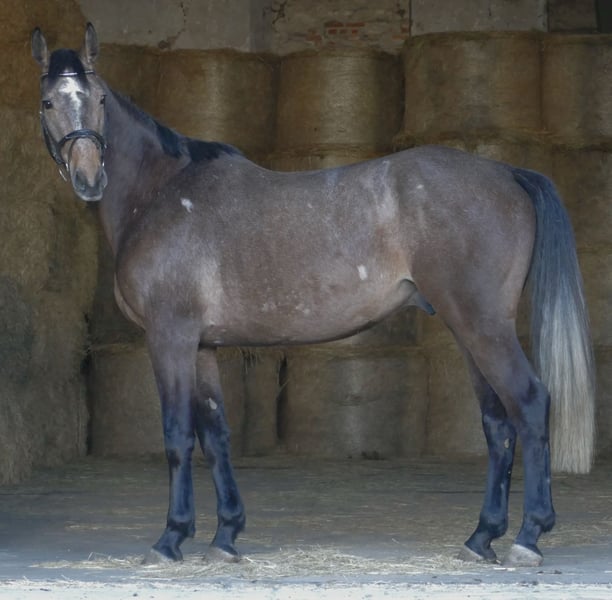 Der 6 jährige, "Mc Fly", abstammend von Mumbai x Cardenio, 1,74 m, ist ein sehr hübscher, mit einer etwas außergewöhlichen Farbe ausgestatteter Wallach. Mc Fly bringt das richtige Maß an Go mit, bleibt dabei jederzeit händelbar und klar im Kopf, am Sprung überzeugt er mit Übersicht und Vermögen. Im täglichen Umgang ist er sehr brav, menschenbezogen, unkompliziert und will alles richtig machen. Mc Fly ist der idealen Kandidaten für jemanden der ein junges Pferd mit einer vielversprechenden Zukunft im Springsport sucht und Erfahrung in der Jungpferdeausbildung hat. Sollte Mc Fly ihr Interesse geweckt haben, können wir gerne ein Kennenlernen bzw. Probereiten vereinbaren. (Gebühr 50€)