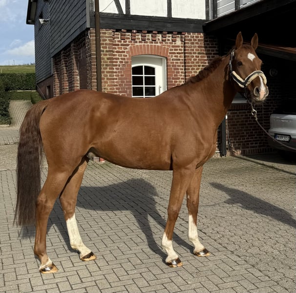 Versatile German Sport Horse for Sale For sale is an elegant and talented gelding, born in 2018. This beautiful chestnut impresses with his friendly nature and good rideability. He is a versatile sport horse and possesses all the qualities necessary for competitive riding. The gelding has limited experience in jumping but always strives to do his best. He learns quickly, approaches fences with confidence, and shows promising development. He is healthy and suitable for ambitious amateurs, as a family or children's horse, or for a competitive rider. If you are interested or have further questions, please feel free to contact us. A test ride can be arranged by appointment.