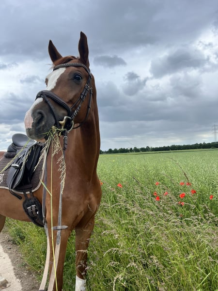 Strahli ist schon mit 1 1/2 Jahren zu mir gekommen, weil ich auf Anhieb schockverliebt war als ich ihn das erste mal gesehen hab! Er besticht nicht nur durch sein schickes Aussehen, sondern auch durch seine sehr kumpelhafte und verschmuste Art. Er beherrscht die M-Lektionen bereits recht sicher und macht auch wirklich einen schönen Sprung. Besonders genießt er auch lange Ausritte durch den Wald. Er ist ein echter Allrounder und dabei immer leichtrittig ☺️ Sehr geeignet auch für Herdenhaltung, da er super verträglich ist und sich mit jedem versteht. Ich gebe ihn wirklich nur sehr schweren Herzens her und wirklich nur in ein liebevolles Zuhause eines ambitionierten Freizeitreiters gerne auch mit Turnierambitionen, aber das sollte nicht im Vordergrund stehen. Mehr hierzu gerne per Telefon.