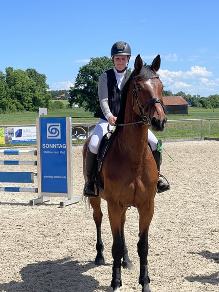 For sale is a 10-year-old Bavarian Warmblood mare standing at 16.1 hands, sired by Lewinski out of Pius. I purchased Lafee as a rough 6-year-old, and she has been trained in a versatile manner, suitable for L-level show jumping (with placements at A**), eventing (VA 2nd place), and L-level dressage (can perform flying changes and beginning traversals), tailored to her pace and in accordance with the training scale. She requires a rider with refined yet clear aids who can handle her mareish side on some days. However, she is never malicious. Her teeth have been checked annually, and she has all necessary competition vaccinations. She has been regularly presented to the farrier (she is barefoot with excellent hoof quality). Apart from minor injuries, she has never been ill. Currently, she is in box stall with daily turnout from 9 am to 5 pm in a mare herd (with three other mares), where she is somewhat lower in the herd hierarchy. She is immediately ready for competition, knows dogs, and enjoys varied work in the indoor arena, on the riding surface, and in the terrain, including free jumping or double lunging. She is also loading calmly and behaves well in handling. Please contact me with any questions and to arrange a personal introduction. (There is a flat fee of €30 for pre- or trial riding.)