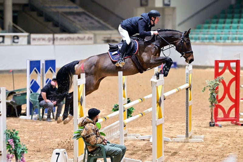 Kir-Royal is a 10-year-old bay German sport horse mare standing at 16.3 hh. She impresses with her intelligence, diligence, and attentive nature. In daily work, she demonstrates motivation, rideability, and a pleasant demeanor. The mare has achieved multiple top placements up to M** level and has competed successfully at S*. She is characterized by her caution, good overview, and willingness to perform over fences. Thanks to her balanced temperament, she can also be ridden daily by children without any issues.