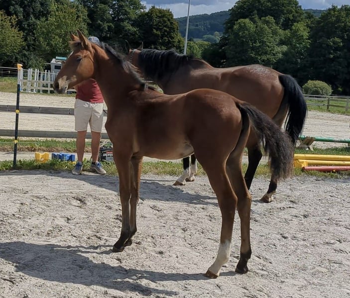 Dalla nostra allevamento offriamo una bella e sportiva puledra con un fondamento corretto. Il padre Chaloubino PS è stato rappresentato con successo in tour internazionali per giovani e ha ottenuto il settimo posto nella finale del Campionato del Mondo per Cavalli da Salto a Lanaken/BEL. Inoltre, può vantare una genetica di salto di alto livello nel suo pedigree, con Cento e Baloubet du Rouet. La madre è stata presentata fino a 105 cm. Il suo padre Jama van de Heffinck è stato di successo fino a S**. Per ulteriori informazioni, contattateci volentieri tramite WhatsApp!!!