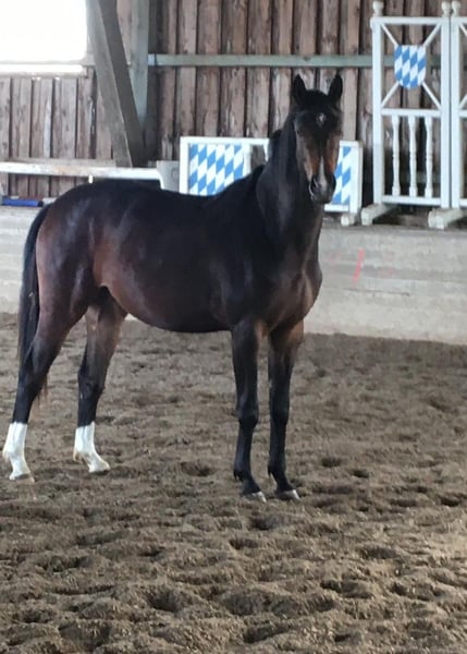 Promising, double-licensed two-year-old mare for sale, in the sought-after dark bay coat. Through her sire Latinum and grandsire Le Formidable, she carries the bloodlines of exceptional sires and Grand Prix winners Bordeaux, Ferro, and De Niro. Her dam line also includes numerous S-class dressage horses and Grand Prix winners. Her dam, Embassina, has a strong show jumping pedigree. Her damsire, Embassy I, is the sire of the world-class horse SAP Escada FRH, which won team gold medals at the European and World Championships under Ingrid Klimke. Due to her outstanding pedigree and confident character, this beautiful two-year-old is a promising candidate for success in dressage, show jumping, and eventing. The sale is only to responsible hands that will appreciate the mare’s potential. Price reflects her quality.