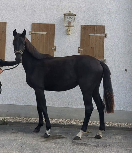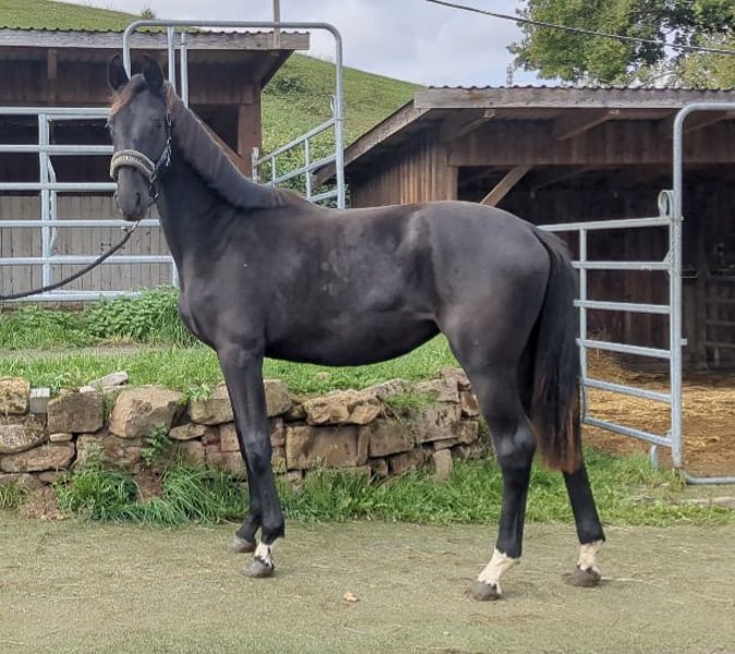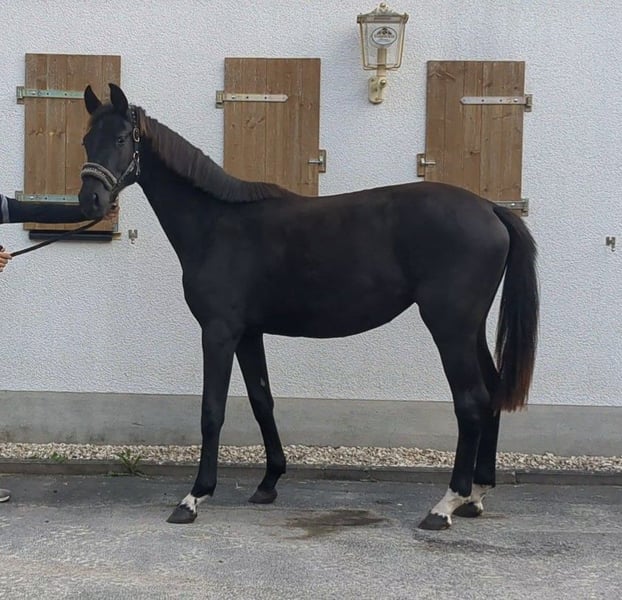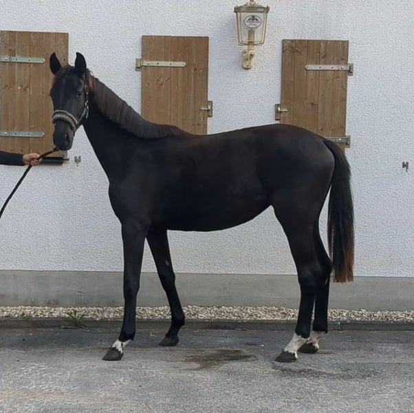 De la Perle is a very smart black filly with 3 very good gaits. She moves very well through the body, is alert and very willing to learn. She also knows how to convince with her correct foundation and an absolutely beautiful face. A promising young talent for the big arena!
