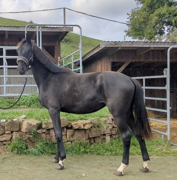 De la Perle ist eine sehr schicke Rappstute mit 3 sehr guten GGA. Sie bewegt sich sehr gut durch den Körper, ist aufgeweckt und sehr lernwillig. Auch mit ihrem korrekten Fundament und einem absolut schönem Gesicht weiß sie zu überzeugen. Ein vielversprechendes Nachwuchstalent fürs große Viereck! Nähere Infos gerne per WhatsApp