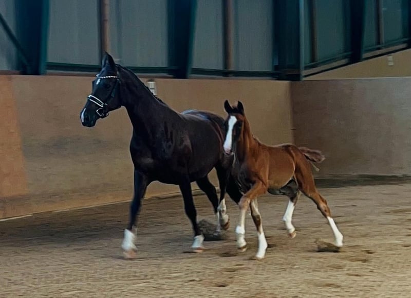 Questa bellissima cavalla è un vero talento emergente per il dressage e si distingue per i suoi movimenti eleganti e di grande struttura. Ha tutto ciò che serve per diventare una futura stella del dressage e colpisce anche per il suo carattere eccellente. Molto affettuosa e tranquilla nel maneggio, offre una gioia assoluta. Alla fine del 2024 è stata svezzata e ora si trova, in modo appropriato per la sua età, con altri puledri in un paddock, dove può crescere in un ambiente naturale. La cavalla proviene da una fattrice esperta e i suoi fratelli maggiori possono essere visionati in loco. Un ulteriore allevamento in loco è possibile previo accordo. A causa di una riduzione del numero di animali, viene ceduta al di sotto del suo valore – un'opportunità unica per acquisire un promettente cavallo giovane! ------- Tutti i nostri cavalli in vendita sono stati regolarmente vaccinati e sverminati sin dalla nascita. Per ulteriori dettagli e domande sui cavalli in vendita, vi preghiamo di contattarci telefonicamente; i messaggi saranno risposti solo in modo limitato.