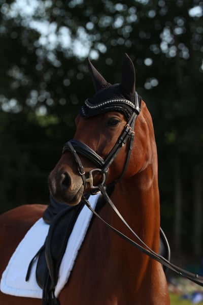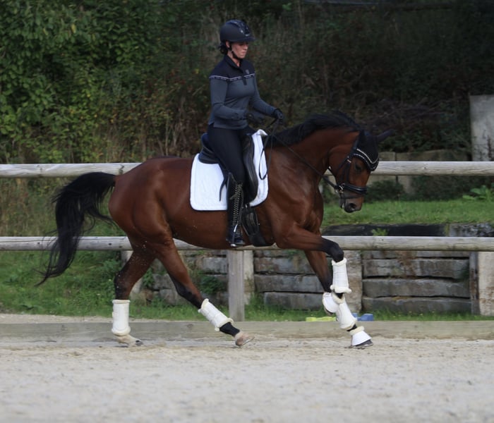 Purtroppo, non è possibile tenere tutti i cavalli, quindi questa cavalla di 4 anni, allevata in proprio, cerca una nuova casa. Ascendenza: Quaterback x Chicago Cup Altezza: attualmente 1,63 m è ferrata e trasportabile È stata cresciuta con molto amore e conosce sia il paddock che la stalla. È stata montata in modo delicato a 3,5 anni e attualmente si trova nella fase di addestramento di base. Ha già vinto il suo primo concorso per cavalli da sella: Passo 8,0 Trotto 7,5 Galoppo 8,0 Ritmo 7,0 Aspetto 7,5 Possiede potenziale per il dressage così come capacità per il salto. Nel campo mostra coraggio e grande gioia, motivo per cui la vedo bene anche nel completo. È estremamente comoda da montare e delicata nell'appoggio. Nella gestione quotidiana è amichevole (non è scossa) e molto affettuosa con le persone. Ha le migliori premesse per un'istruzione versatile nello sport o in un ambito ricreativo ambizioso. Sarà ceduta esclusivamente a mani esperte e in grado di sostenere giovani cavalli, poiché mi sta molto a cuore il suo benessere futuro. Video e ulteriori informazioni su richiesta.
