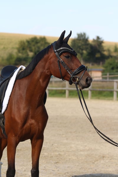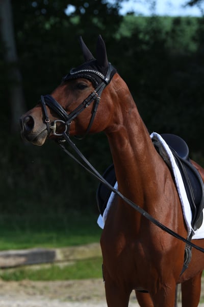 Unfortunately, not all horses can be kept, so this 4-year-old mare from our own breeding is looking for a new home. Pedigree: Quaterback x Chicago Cup Height: currently 1.63m Shoeing and loading-friendly She has been raised with a lot of love and is familiar with both pasture and box housing. She was gently backed at 3.5 years old and is currently in basic training. First riding horse test won directly: Walk 8.0 Trot 7.5 Canter 8.0 Rideability 7.0 Exterior 7.5 She has potential for dressage as well as jumping ability. In the field, she shows herself to be brave and full of joy, which is why I can also imagine her well in eventing. She is extremely comfortable to sit on and light in the contact. In daily handling, she is friendly (not mareish) and very people-oriented. She brings the best prerequisites for versatile development in sports or an ambitious leisure area. She will only be placed in supportive and experienced young horse hands, as her further well-being is very important to me. Videos and further information available upon request.