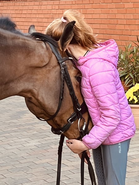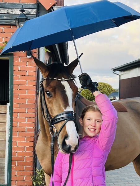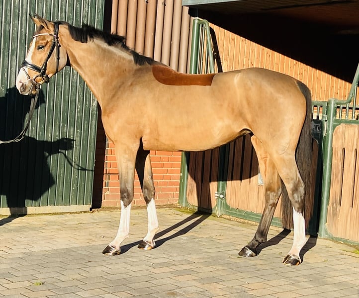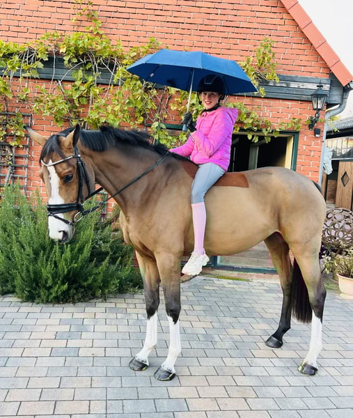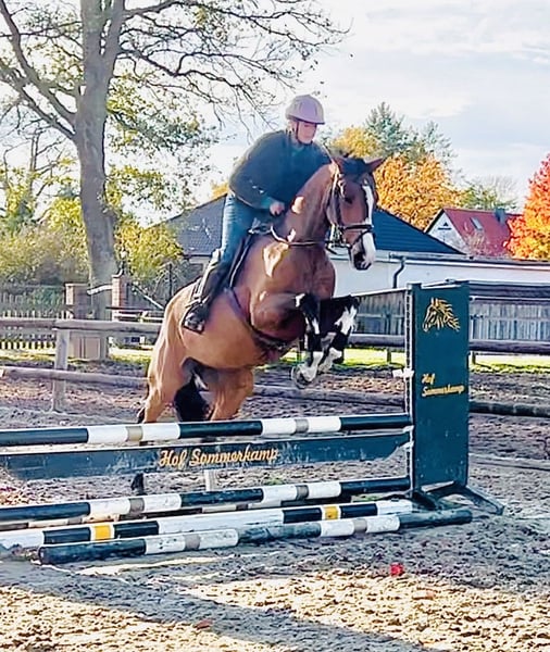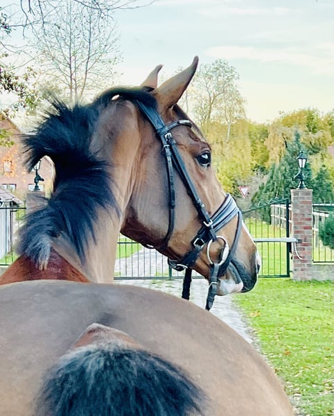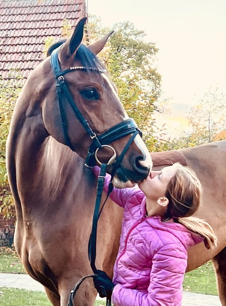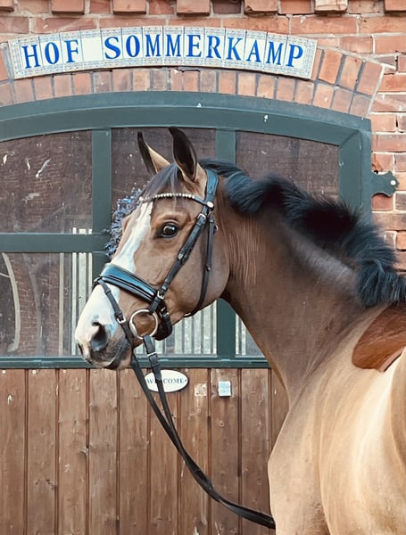 Unsere Stute „Sunflair“ (Rufname Sunny) ist 3,5 Jahre alt und hat derzeit ein Stockmaß von 1,65m. Ihr Vater „Sir Barver“ist ein hervorragender Dressurvererber v. Soliman de Hus x Rubinstein, der Rittigkeit und Charakter vererbt hat. Sunny’s Mutter ist eine rein springgezogene Stute v. Calvados x Zeus. Somit wurde Sunny bereits genetisch ein vielseitiges Talent in die Wiege gelegt. Sie wurde im Frühjahr dieses Jahres schonend angeritten. Sie hat von Anfang an unglaublich gut mitgearbeitet und wollte es ihrem Reiter immer Recht machen. Nach dem Anreiten durfte sie dementsprechend noch einmal den Sommer auf der Weide genießen. Vor wenigen Wochen haben wir sie erneut ins Training gebracht und sie macht täglich sehr gute Fortschritte. Sie ist absolut unerschrocken und anständig unter dem Sattel, hat ein ausgeglichenes Temperament und eine hervorzuhebende Leistungsbereitschaft. Sie bewältigt bereits kleine Sprünge mit gutem Überblick und kennt Ausreiten in der Gruppe und alleine. Sie erscheint als perfektes Amateurreitpferd für Jugendliche und Damen. Sie verleiht ihrem Reiter viel Sicherheit und ist daher auch für ängstliche Reiter (trotz ihres Alters) geeignet. Bei weiterer Ausbildung können wir uns auch vorstellen, dass sie eine interessante Hunter-Offerte werden könnte. Auch im Umgang ist sie menschenbezogen, stets freundlich und gut gelaunt. Sie hat einen sehr guten Tüv (mit Röntgenbildern vom Rücken) ohne Befund. Ein aussagekräftiges Video kann gerne per WhatsApp verschickt werden. Die Stute kann jederzeit nach Absprache ausprobiert werden. Für weitere Rückfragen stehen wir gerne zur Verfügung.