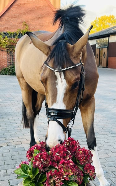 Our mare "Sunflair" (nickname Sunny) is 3.5 years old and currently measures 1.65 meters at the withers. Her sire, "Sir Barver," is an excellent dressage stallion by Soliman de Hus out of Rubinstein, known for passing on rideability and good character. Sunny’s dam is a pure show jumping bloodline mare by Calvados out of Zeus, making her a genetically versatile talent from the start. She was gently backed earlier this spring and has shown incredible willingness to work from the beginning, always striving to please her rider. After her initial training, she enjoyed a summer break on the pasture. A few weeks ago, we resumed her training, and she is making very good progress every day. She is absolutely fearless and well-behaved under saddle, with a balanced temperament and an outstanding willingness to perform. She already handles small jumps with good overview and is experienced in riding out in groups or alone. She appears to be an ideal amateur riding horse for young riders and ladies. She provides her rider with a lot of confidence and is suitable even for more nervous riders despite her age. With further training, she could also develop into an interesting hunter prospect. In handling, she is very people-oriented, always friendly and cheerful. She has a very good veterinary report (including X-rays of her back) with no findings. A detailed video can be sent via WhatsApp upon request. The mare can be tried out at any time by arrangement. Please feel free to contact us for further questions.
