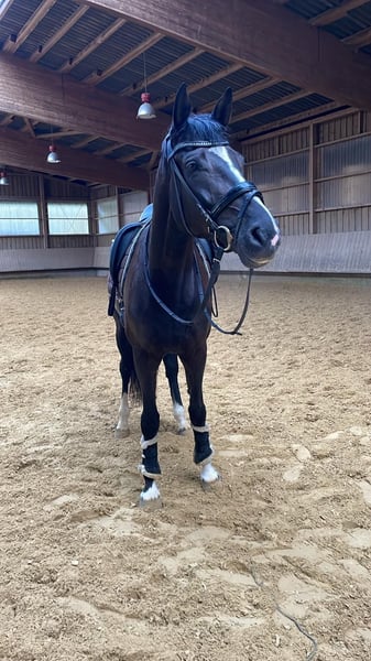 Ich suche für meine 6-jährige Stute Soli (Secret x Weltmeyer) ein neues, liebevolles Zuhause. Soli ist eine feine, angenehm zu sitzende Stute mit einem außergewöhnlich freundlichen Charakter und stets positivem Arbeitswillen. Sie beherrscht sicher alle A-Lektionen, geht bereits alle Seitengänge, zeigt im täglichen Training eine gute Versammlungsbereitschaft und ist stets bemüht und motiviert. Soli bleibt stets kopfklar und passt sich ihrem Reiter an, sodass sogar meine Töchter (7 und 9) ihre Runden mit ihr drehen können. Aktuell ist sie leicht überbaut. Im Springen, bisher wenig gefördert, zeigt sie Freude an der Aufgabe und meistert Stangenarbeit zuverlässig und kleine Sprünge gern. Im Gelände ist sie absolut nervenstark, unerschrocken und geht zuverlässig allein oder in der Gruppe. Sie kennt Bodenarbeit, vielseitige Breitensportaufgaben und sogar das Reiten mit dem Westernsattel. Soli ist sehr sozial, verträglich mit allen Pferden und kennt sowohl Boxen- als auch Offenstallhaltung. In unserem Besitz seit Fohlenalter, erfreute sie sich stets bester Gesundheit, ist verladefromm, brav beim Schmied und regelmäßig geimpft und entwurmt. Als Fohlen goldprämiert. Ich gebe sie ab, weil sie mir zu klein bleibt Sie verdient einen Menschen, der ihre liebenswerte Art schätzt und ihre Vielseitigkeit weiter fördert.
