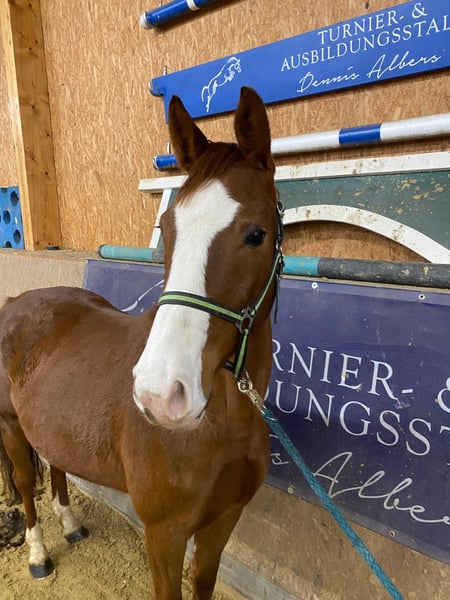 For Sale: German Sport Horse – Versatile Dressage Mare We are offering an elegant and promising German sport mare, born in 2020. This attractive chestnut mare impresses with her harmonious appearance and balanced temperament. Standing at 16.1 hh, she provides an ideal size for ambitious riders seeking a reliable partner for dressage. The mare is well-schooled and already demonstrates promising initial movements in dressage. She has a solid basic training, is attentive and eager to learn, making her an excellent prospect for upper-level dressage. Her pleasant character and willingness to work make her appealing to both ambitious amateurs and professional riders. This German sport horse convinces through her quality, movement, and potential to develop further in dressage. A true all-round talent that, with proper support, can achieve a great deal. For inquiries or further information, please do not hesitate to contact me. Arrange a viewing appointment and see for yourself this promising dressage partner.