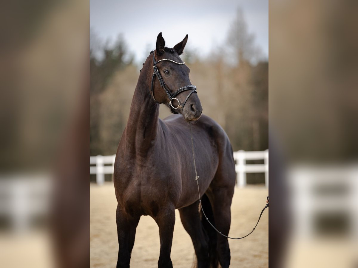 This beautiful 5 year old mare is looking for a new home. She has been with us since she was 6 months old and was gently broken in at the age of 4. She has already shown at her first shows that she is extremely fearless and calm, but still has great basic gaits so that she has already won a test for young riding horses. She is now confident in the outside canter and has already mastered the simple changes. Even flying changes are no longer a foreign concept. We have also started practicing lateral movements, but only recently. She is very easy to ride (even by youngsters here at the stable) and is just as well-behaved in the field. A horse that is always fun and wants to please. I will be happy to answer any further questions by telephone on 0160 1662003.
