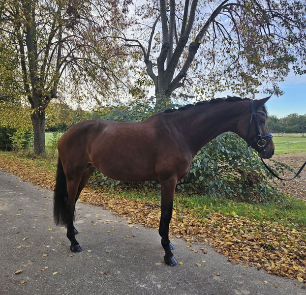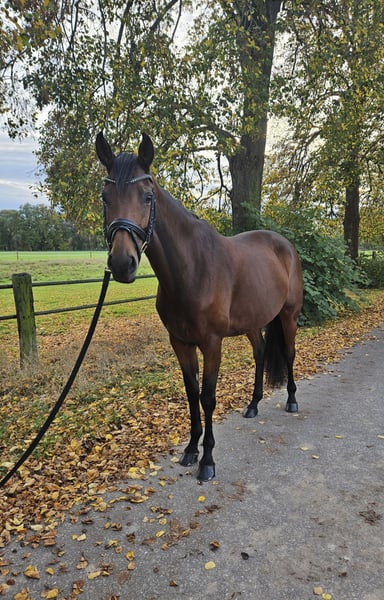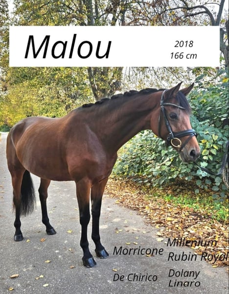 MALOU, eine bildschöne Stute abstammend von Morricone x De Chirico, die mit ihrer Ausstrahlung stets alle Blicke auf sich zieht. Sie ist mit 3 sehr guten Grundgangarten ausgestattet und einer enormen Rittigkeit, ganz fein in der Anlehnung, toll zu sitzen, nicht glotzig und mit dem nötigen Go ausgestattet, was weder zu viel noch zu wenig ist. Ihre bisherigen Turnierstarts meisterte sie souverän und konnte sich mit hohen Noten mehrfach an vorderer Stelle in Dressurpferdeprüfungen der Kl. M platzieren. Gute Ansätze für Piaffe/ Passage runden ihr Talent und die Perspektive für den großen Dressursport ab. Da sie sehr menschenbezogen ist, wünschen wir uns für Malou ein tolles Zuhause, wo sie geliebt und geschätzt wird.