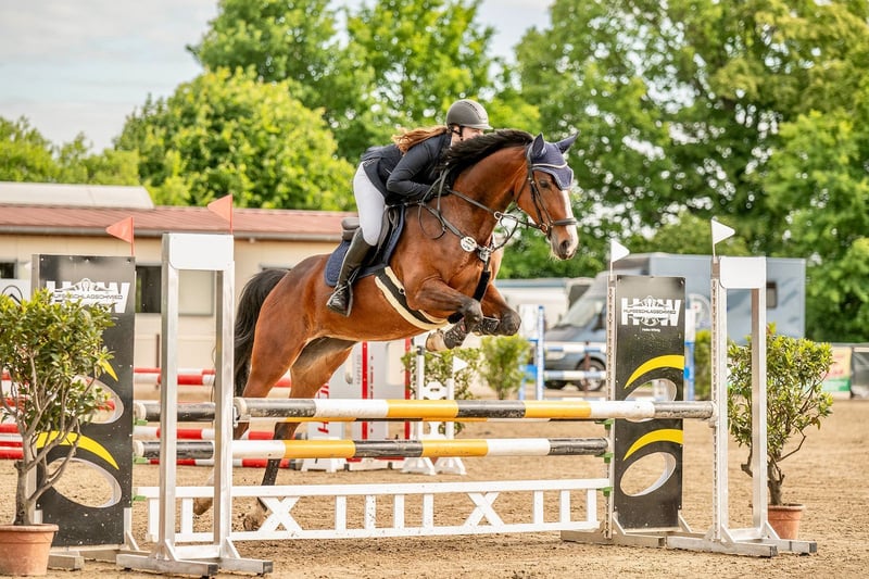 Montana is a stunning, charming, and well-mannered mare with an excellent work attitude and a wonderfully comfortable seat. She impresses with her rideability, her connection to her rider, and her motivation – she wants to please her rider and always works with engagement. Under saddle, she demonstrates willingness to perform, is light in the contact, and offers a pleasant, consistent connection. She can be ridden with gentle aids, requiring no excessive strength, and provides a very harmonious riding experience. In the show jumping ring, she is reliable, attentive, and always eager to go to the other side. Due to her rideability and good basic gaits, I can also easily envision her excelling in dressage. Montana is easy to re-ride for anyone and is well-behaved. However, she is not suitable as a beginner or children's horse. At competitions and in training, she jumps reliably and confidently (plank, water, series, wall, etc.), although she can be somewhat environmentally sensitive. Montana has competed up to A-level show jumping with scores up to 7.8, won a style jumping class with an 8.1, and has competed in young horse classes up to L. She took a break from competition last year due to my maternity leave, and I have also competed sparingly this year – so she remains relatively fresh. Montana is healthy, regularly vaccinated, dewormed, and osteopathically treated. Her teeth were checked and treated this year. She is also shoe- and loading-broomer safe. A trial ride is possible at any time by arrangement.