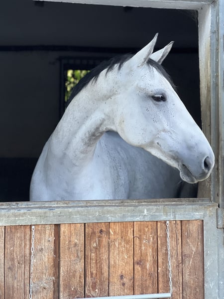 For sale: German sport mare – ideal for dressage! This elegant mare was born in 2018 and impresses with her striking appearance and talent. Standing at 16.1 hh, she offers the perfect size for ambitious riders. Her dark bay tobiano coat gives her a unique look and makes her a real eye-catcher. She is a talented dressage horse, already demonstrating promising fundamentals and developing well in training. Thanks to her friendly nature and eagerness to learn, she is suitable for both advanced riders and those taking their first steps in dressage. If you are interested or would like more information, please feel free to contact me. Viewings and test rides are available by arrangement.