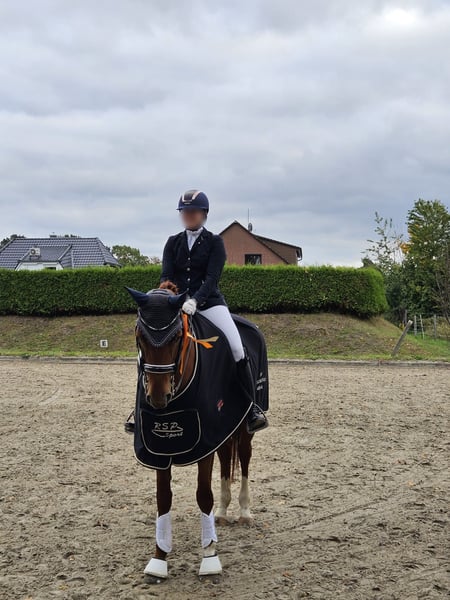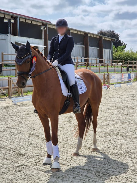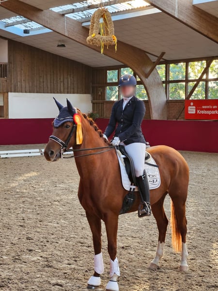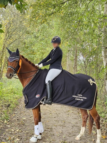 Victorious in dressage tests at the M level, this energetic mare was among the top ten most successful horses in her breeding association at ages five and six. She has the potential to be further trained for the advanced (Grand Prix) level in the upcoming season. She has been trained and continues to be handled by an amateur rider, impressing with excellent rideability, expressive movements, an outstanding walk, high learning ability, suppleness, and strong nerves. Both under saddle and in daily handling, she is well-behaved and reliable. This mare is very refined and sensitive; she prefers to be ridden with finesse rather than force. Once she has bonded with her rider, she is extremely cooperative, eager to perform, and motivated. She is ideally suited for young riders with national team ambitions, as well as for riders who enjoy working with a high-quality, eager, and trainable horse. In handling, she is uncomplicated: she is shoe- and loading-safe, lives easily in a mare herd, and is socially well-adjusted. She is relaxed both alone and in groups in the terrain and enjoys swimming in lakes.