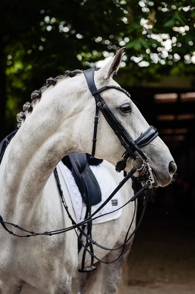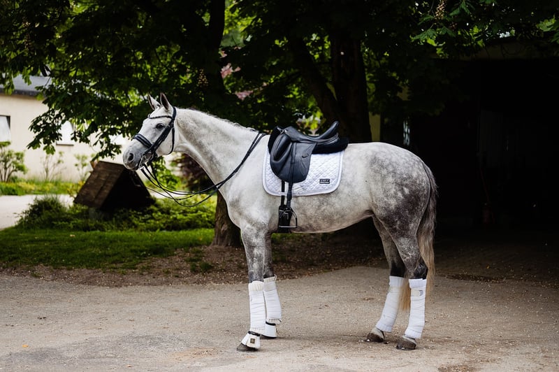 For sale is a beautiful DSP mare - German Sport Horse - Mare - 2017 - Gray - Approx. 170 cm - Dressage For sale is a very safe dressage mare with athletic potential and an ideal character. Chanel has excellent pedigree, very good conformation, and a great temperament. The horse is regularly worked under saddle, under the supervision of a professional, and has experience in dressage training. She has competed in events up to Class C with very good results. The mare is characterized by her ease in performing flying changes and has great potential for further development. The mare stands out with her balanced temperament – suitable for a child/junior as an introductory horse, an ambitious amateur, as well as a more advanced rider. She is well-behaved in daily handling, calm during transport, and has no issues with the farrier or veterinarian. Well-socialized, she enjoys contact with humans and other horses.