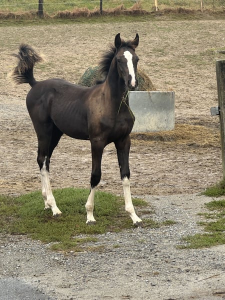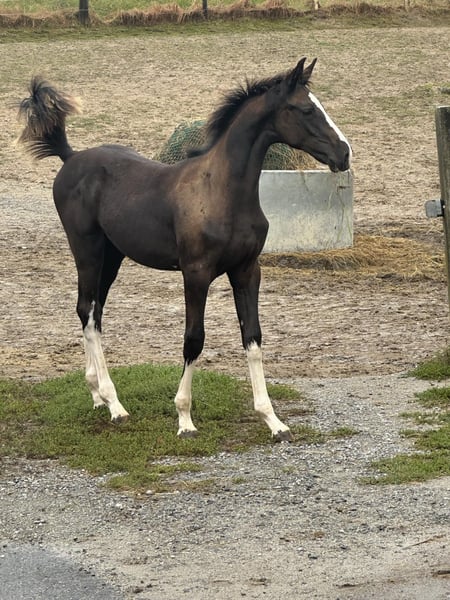 Lord Frechdachs AB is an exceptionally well-behaved, double-talented, and very resilient young horse. His sire is our homebred Holsteiner premium stallion and HLP winner, Lord Fernando AB, who impresses with outstanding rideability and strong aptitude for both dressage and jumping. His grandsire, Lamborghini Boy, was also double-talented (show jumping S, dressage). Like all his offspring, he is a characterful and trustworthy horse. Escarda, the dam of Lord Fernando AB, was successful up to S level in show jumping. The dam of Lord Frechdachs AB, Diabola, a De Niro daughter, has two full brothers who competed successfully up to S level and international competitions. His full brother, Lord of Life AB, was recently backed here at the stud and convinced his owners completely as a very rideable, social, performance-oriented, double-talented, and always fun leisure horse for the whole family. Lord Frechdachs AB is raised appropriately in a herd with older, experienced companions and seven other geldings of various ages. Thanks to the Bavarian low mountain landscape, with diverse terrain and a 24/7 summer pasture that also serves as a food source, all our horses have the best conditions for healthy growth. Naturally, all of them have mastered the foal basics and have already been transported in the trailer to the pasture. They all handled this excellently.