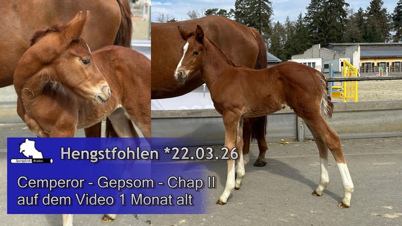 Sportpferde Bruhns: 0(049) 173 / 75 82 768, www.sportpferde-bruhns.de, email:sportpferde.bruhns@aol.com Hengstfohlen geb. 22.03.2026 von Cemperor - Gepsom - Chap II, 1 Monat alt auf dem Video, Colt born 22.03.2026 by Cemperor - Gepsom - Chap II, 1 month old on the Video, Weitere Verkaufspferde auf www.pferdeverkaufsmarkt.de Unsere Hengststation: https://youtube.com/playlist?list=PLyBHusjG9UXqSSpriw2tFl38bsmOkEiOY Unsere Partner: CWD Deutschland https://eu.cwdsellier.com/de/ Harald Bruhns GmbH https://bruhns-gmbh.de PFG - Physio for goldjumpers https://www.physio-for-goldjumpers.de