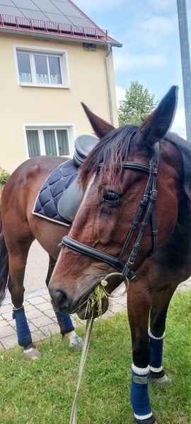 Verkaufe schweren Herzens meine Traberstute. Wegen Scheidung kann ich sie leider nicht behalten. 8 Jahre alt, 1,55cm groß. Habe sie im März 2024 gekauft. Eine Seele von Pferd. War anfangs sehr misstrauisch und ängstlich gegenüber Traktoren und anderer Verkehrsteilnehmer. Mittlerweile sehr entspannt unterwegs. Sehr aufmerksam und fleißig. Läuft an der Longe und im Gelände. Mit Kindern sehr bedacht. Meine 2 Tochter 7+4 hat sie gerne im Schritt durchs Gelände getragen. Sie lief eine Zeit lang auf der Rennbahn. Wurde dann, bevor ich sie gekauft habe, aus dem Sport genommen. Abstammung ist vorhanden. Aufgrund von Zeitmangel im Galopp nicht gefördert. Damit hat sie noch Schwierigkeiten. Wird als angeritten verkauft. Ausdrücklich nicht als Fahrpferd! Reines Freizeit-Reitpferd oder reitbarer Beisteller. Könnte sie mir gut auf Wanderritten vorstellen, dann allerdings mit Beschlag oder Hufschuhen. Steht derzeit im Offenstall mit einer Ponystute, kennt aber auch Boxenhaltung. Bei weiteren Fragen gerne schreiben. Gerne anschreiben und nicht nur merken. Platz vor Preis