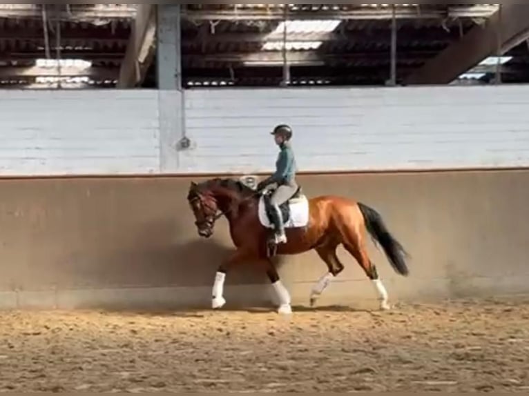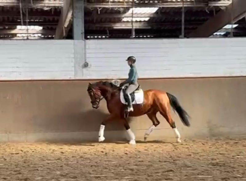 Hannoverian Gelding – Promising Youngster for Dressage This charming bay Hannoverian gelding was foaled in 2022 and impresses with his promising pedigree and noble appearance. Standing at 16.1 hh, he offers the ideal size for ambitious riders who value quality and potential. The young gelding is already well accustomed to handling and exhibits a very friendly and eager-to-learn demeanor. His typical elegance and pronounced movement talent make him a promising dressage prospect for advanced amateurs or competitive riding. His solid basic training has been carefully developed, and he already shows initial promising strides in dressage work. With his harmonious movement and pleasant character, he is a reliable partner ideally suited for building a successful dressage career. A horse with great development potential, convincing through both his quality and friendly nature. For further information and a personal impression, I am happy to be at your disposal.