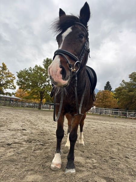 Der bildschöne 19-jährige Tinker-Mix Brownie (Stockmaß ca. 139 cm) fand im September den Weg in unsere Obhut. Leider änderte sich die Lebenssituation seiner Familie und so musste sie sich schweren Herzens von ihm trennen. Brownie ist ein freundlicher, charakterstarker und neugieriger Ponybub, der mit seiner sanften Art alle Herzen im Sturm erobert. Er ist überaus verschmust und kuschelt für sein Leben gern. Besonders im Gesicht genießt er es in vollen Zügen mit sanften Berührungen gestreichelt zu werden. Brownie ist überaus menschenbezogen, anhänglich und sucht stets die Nähe seiner Menschen. Im täglichen Umgang zeigt er sich überaus brav und unkompliziert. Er liebt es umsorgt zu werden, beobachtet aufmerksam, was um ihn herum geschieht und reagiert sensibel auf Veränderungen. Seine Menschen sollten daher besonders einfühlsam sein und ihm viel Sicherheit und Vertrauen schenken. Der hübsche Wallach ist ein echter Allrounder und lässt keine Wünsche offen. Brownie ist geländesicher und geht leidenschaftlich gerne – gemeinsam mit seinem Menschen – auf Erkundungstour. Auch Geschicklichkeitstrails, Hindernisparcours mit kleinen Sprüngen und Bodenarbeit bereiten ihm große Freude. Brownie ist ranghoch, aber ein fairer Herden-Chef und sowohl mit Stuten als auch mit Wallachen unkompliziert und verträglich. Er erfreut sich bester Gesundheit, ist vollständig geimpft, entwurmt und gechippt. Für sein zukünftiges Zuhause wünscht sich Brownie eine Offenstallhaltung oder alternativ eine Nachtbox mit täglichem Weidegang, wo er ausreichend Bewegung, Gesellschaft und liebevolle Betreuung genießen darf.