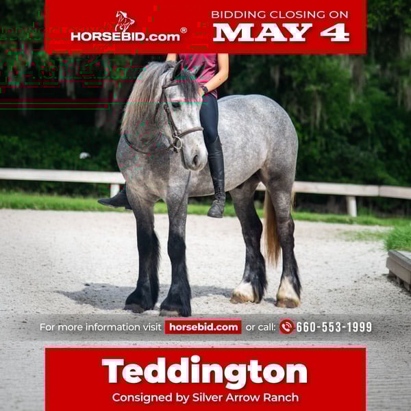 ▪️▫️◾️𝐭𝐡𝐞 𝑴𝒂𝒚 𝐒𝐞𝐥𝐞𝐜𝐭◾️▫️▪️ Happening now thru MONDAY | MAY 4th - Available EXCLUSIVELY on HorseBid's website! For more details and to register visit: www.Horsebid.com CONSIGNOR CONTACT: Silver Arrow Ranch 660-553-1999 LOCATION: Ocala, FL BREED: Gypsy X REGISTERED: No COLOR: Grey HEIGHT: 14.2 AGE: 3 GENDER: Gelding ✨ Teddington “Teddy” – Beauty, Brains, and a Heart You Can’t Teach ✨ Some horses turn heads… Teddy steals hearts. Teddington, lovingly known as Teddy, is a 3-year-old Gypsy Vanner cross who already carries himself like an old soul. With his striking presence and soft, kind eye, he’s the kind of horse you notice immediately—but it’s who he is on the inside that makes him unforgettable. For such a young horse, Teddy has already experienced more than most. He’s been ridden bareback, jumping, lessons, Western, and English, has schooled dressage basics, gone cross country, and happily hit the trails and beaches. He’s been on moonlit rides, traveled off property multiple times, and takes every new experience in stride with a quiet confidence that’s rare to find. He doesn’t just do the job—he understands it. Teddy is the perfect blend of beauty, talent, and brains. He’s willing, level-headed, and tries his heart out for his rider every time. He’s the kind of horse that meets you halfway, that wants to learn, and that makes you excited for every ride because you know he’s going to give you everything he has. And when the ride is over, he’s just as special—gentle, kind, and easy to be around. The kind you find yourself lingering with a little longer at the barn. Teddy isn’t just a nice young horse—he’s the kind you build a future around. Xrays and PPE on file