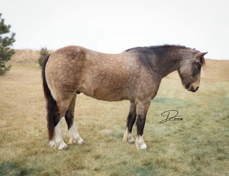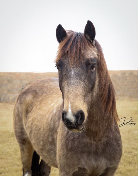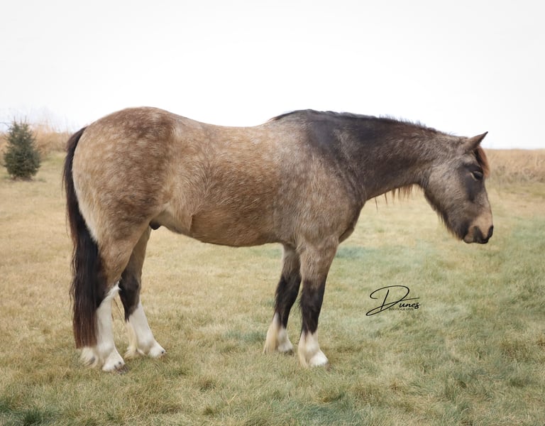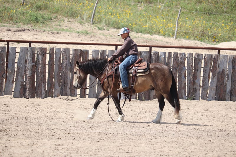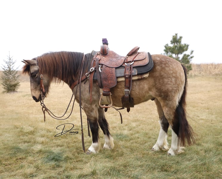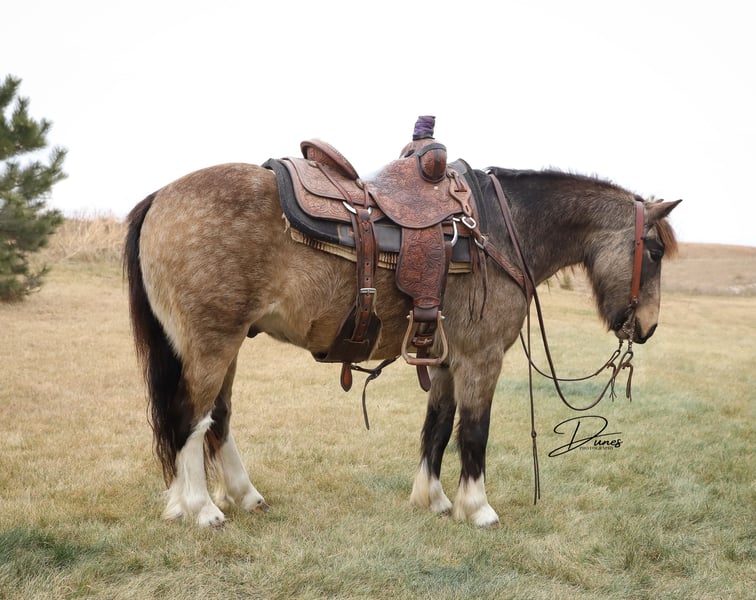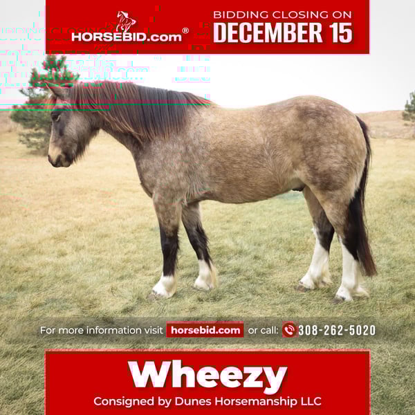 🎄𝐓𝐇𝐄 𝑯𝒐𝒍𝒊𝒅𝒂𝒚 𝐂𝐋𝐀𝐒𝐒𝐈𝐂🎄 Happening now thru MONDAY | DECEMBER 15th - Available EXCLUSIVELY on HorseBid's website! For more details and to register visit: www.Horsebid.com CONSIGNOR CONTACT: Dunes Horsemanship LLC 308-262-5020 LOCATION: Thedford, NE BREED: Gypsy Cross REGISTERED: No COLOR: Buckskin HEIGHT: 13.2 AGE: 3 GENDER: Gelding Wheezy is a three year old Gypsy cross with just enough feather and foot to make him look fancy, without all the upkeep that comes with the full blood gypsies! He stands 13.2 and his feet are big enough to make some quarter horses blush! He is currently giving his best impression of a wooly mammoth, but he sheds out into a dark buckskin in the spring and hangs onto those big pretty dapples! Nowhere in my plans did I have offering Wheezy written down, and believe me when I say, it breaks my heart to let him leave, but he is simply too good to keep hidden away here in these hills when he will bring so much joy to a family needing something safe, sound, and reliable. Wheezy walks out like a big horse and has drug a handful of calves at brandings this spring, gathered pastures as the sun came up, and meandered through town this summer. He knows his leads, is starting to get his flying lead change figured out, has a fancy little spin, and is nice and soft in either a bridle or just a halter. He will cross water, loads and unloads with ease, and would halter himself if he had thumbs. He is an absolute pet and loves to be in your pocket any chance he gets. Though he is young, he is an old soul and has never once left me feeling unsafe. Brush the snow off his back and crawl on. He will get you to and from safe and sound! I truly feel he would be suitable for anyone ready to step up from that old faithful to a young and eager yet SAFE gelding. Wheezy is still perfecting his neck rein, but he is the PERFECT project for your little one who is ready to finish their own horse their way, without the risk of starting a colt from scratch. He has a fantastic foundation and is ready for his next family. He has packed kids around some in the arena and is ready to find his forever family with hopefully a handful of kids to teach to love horses! Wheezy has been an absolute joy to have and anyone who is lucky enough to bring him home, will be certain to never find another like him! As with any of our horses, please bring him back at any time for a refresher should you ever feel the need, or just to brush off the cobwebs after a long winter. We want nothing more than for Wheezy to be loved and enjoyed by his new family and we we will go above and beyond to make sure he find his forever! Please reach out with any questions you may have or to come take him for a spin! Tess Chytka Dunes Horsemanship LLC 308-262-5020