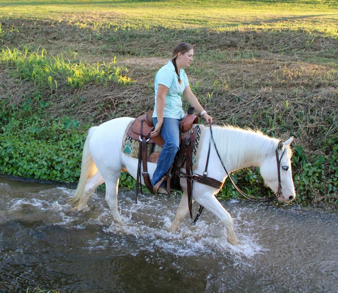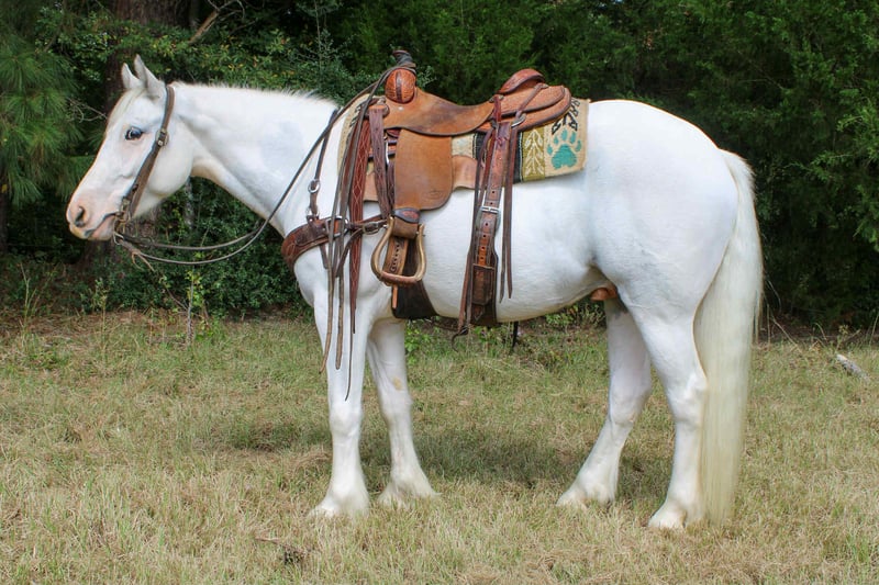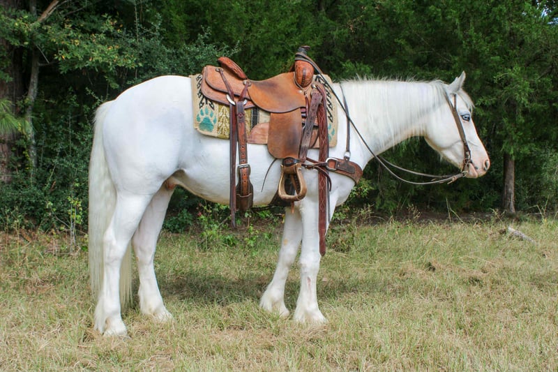 ONLINE AUCTION Place your bids at www.PlatinumEquineAuction.com Starting Bid $3500 Auction ends October 19th, 2025 Need a new saddle? Check out White Rock Saddles on our website or Facebook Marshmallow is an adorable 4 year old gray and white paint Gypsy/pony cross gelding. He stands 14 hands tall, with a long mane and tail, feathered feet, and one blue eye he is sure to catch everyone’s attention. Marshmallow is easy to catch, groom, trim, and load. He stands tied quietly for baths, spray, and saddling. Marshmallow has been ridden at brandings, gathered cattle, and out on the trails. He crosses water and traverses any terrain. He would excel as a trail horse, ranch pony, or play day horse for the kids. Marshmallow has been rode in town, carried flags and has been hauled to lots of trail camps and is absolutely gentle. He is light in the face, moves oft leg ques and neck reins. He is full of personality and easy to love! If you’re looking for a gentle and safe little gelding here he is! Located in Rusk, TX. Contact Rachel with TR Livestock 605-370-4644 with any questions. ONLINE AUCTION Place your bids at www.PlatinumEquineAuction.com Starting Bid $3500 Auction ends October 19th, 2025 Need a new saddle? Check out White Rock Saddles on our website or Facebook