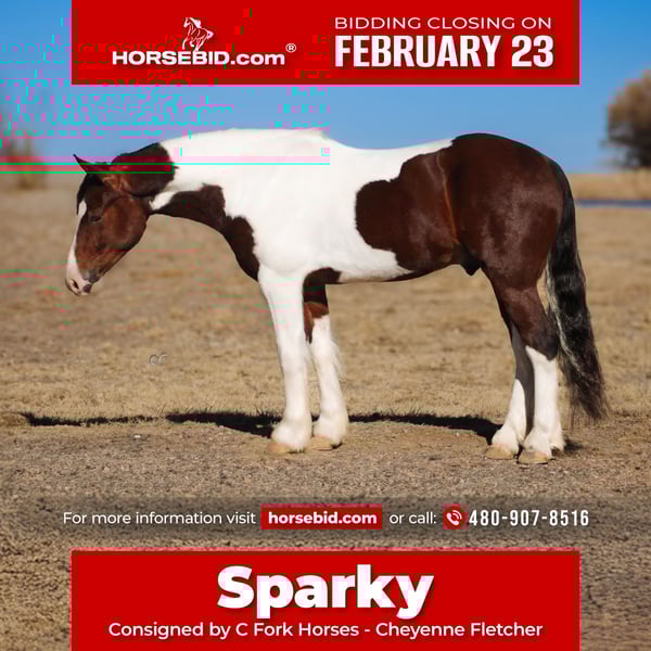 💎 𝐓𝐇𝐄 𝓓𝓲𝓪𝓶𝓸𝓷𝓭 𝐒𝐇𝐎𝐖𝐂𝐀𝐒𝐄 💎 Happening now thru MONDAY | FEBRUARY 23rd - Available EXCLUSIVELY on HorseBid's website! For more details and to register visit: www.Horsebid.com CONSIGNOR CONTACT: C Fork Horses - Cheyenne Fletcher 480-907-8516 LOCATION: Amarillo, TX BREED: Gypsy Vanner Cross REGISTERED: No REGISTERED NAME: Sparky COLOR: Paint HEIGHT: 14.1 AGE: 5 GENDER: Gelding Sparky is a 2022 Gypsy Cross Paint gelding standing 14.1 hands. Stout made, cool looking, and a really convenient size for any job. He is sound, healthy, and built with good bone and substance. The kind that’s made to last. He’s been ridden a lot in the feed yard, used outside to gather and ship cattle, penned cattle at the stockyards, and has covered plenty of country on the trail. He’s been around traffic, wagons, dogs, and everyday ranch life. He’s the kind that makes ranch chores a little easier and saddling a little less of a mental commitment. In the arena, he transitions up and down through his gaits and lopes some of the prettiest circles. Good stop and back up too. On the ground, he’s the kind people naturally like. Friendly, meets you at the gate, in your pocket, easy to saddle, easy to be around day to day, and gets along well with other horses. He is very kind. He’s been used, handled, and exposed and is at a really good place to keep building on. There’s a solid foundation there and plenty left for someone to take him whatever direction fits them best. I also think he could cross over nicely into an English program. He loves jumping logs and barrels, and he’s got enough cadence and natural style that he could be fun to sport over fences or go down the rail. If you like buying them with a good start and plenty left, you’ll appreciate this one. The kind you can take home, go use, enjoy, and keep moving forward with. We’re an open book on Sparky and want people to feel good about what they’re buying. Whether he ends up being someone’s long-term partner or one they keep improving and take another direction with later, we think they’ll find him to be a pretty cool horse to have around. Feel free to come check Sparky out or visit with Cheyenne @ 480-907-8516 // We are located in Amarillo, Texas and can help arrange transport to any location.