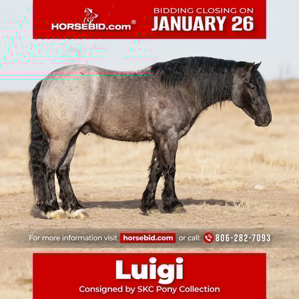 𝐉𝐀𝐍𝐔𝐀𝐑𝐘 ⭐️𝑨𝒍𝒍 𝑺𝒕𝒂𝒓 𝑳𝒊𝒏𝒆𝒖𝒑⭐️ Happening now thru MONDAY | JANUARY 26th - Available EXCLUSIVELY on HorseBid's website! For more details and to register visit: www.Horsebid.com CONSIGNOR CONTACT: SKC Pony Collection 806-282-7093 LOCATION: Canyon TX BREED: Gypsy pony REGISTERED: No COLOR: Blue roan HEIGHT: 13.1 AGE: 6 GENDER: Gelding Luigi is an adorable 13.1-hand blue roan pony with a kind heart, exceptional mind, and the gentlest disposition imaginable. He is a real deal dream pony! Luigi has been hauled to horse shows play days, junior rodeos, and brandings. He has pushed calves, roped slow calves, packed little kids gathering cattle, carried flags in grand entries, handled gunfire and fireworks, and even stepped out in parades with total confidence. He has also been ridden English, showcasing his versatility. In addition, Luigi is trained to curbside mount and will lay down on cue, making him easy, fun, and accessible for riders of all ages. On the trail, Luigi is safe and steady—unbothered by traffic, wildlife, or new environments. Under saddle, he lopes around smooth and cadenced, stops easily, has slow, correct one-handed spins, and a silky jog with a fun, floaty trot. His transitions are effortless, and there is nothing intimidating about him. Luigi is THE perfect confidence builder—honest, broke, and trustworthy enough to ride with a string around his neck. He is a once-in-a-lifetime pony that offers safety, reliability, and endless memories for a lucky child.