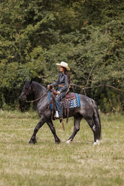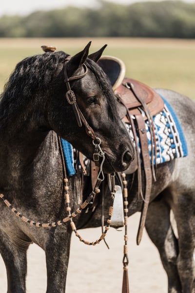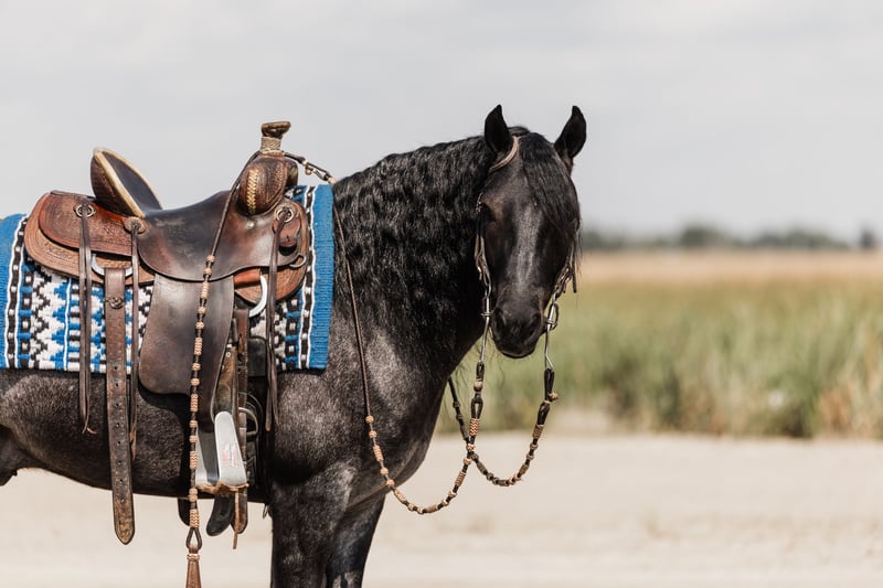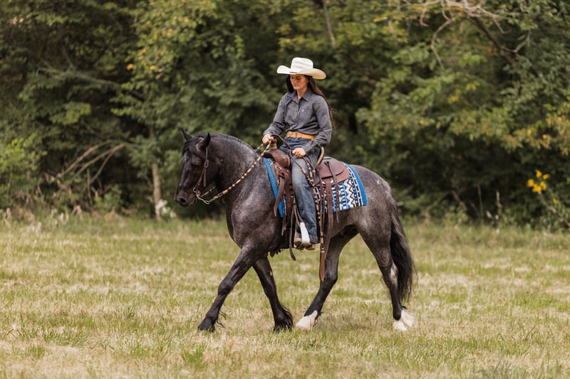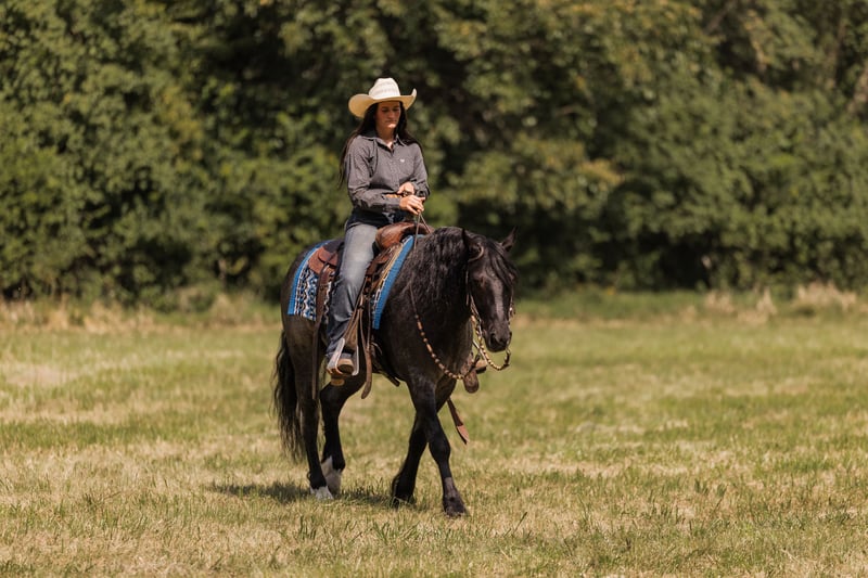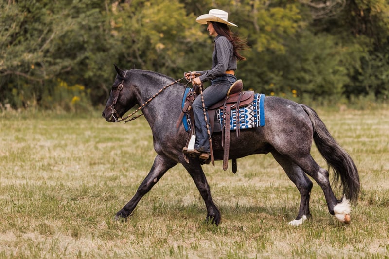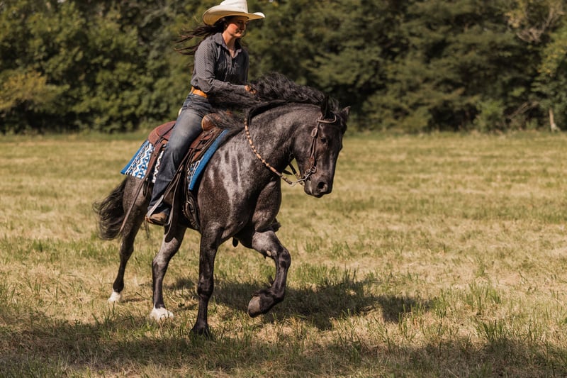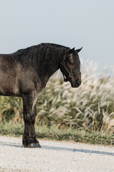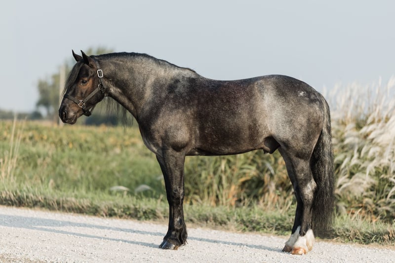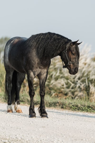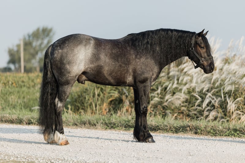 The Gypsy Horse has a distinctive and eye-catching appearance that sets it apart from other breeds. They are known for their long, flowing manes and tails, which are often kept thick and untrimmed. The feathering on their feet is also a characteristic trait of the breed, adding to their unique look. The breed comes in a variety of colors and patterns, including black and white, brown and white, and piebald, and they often have a very stocky build. Their compact size, coupled with their powerful build, makes them an ideal breed for both riding and driving.