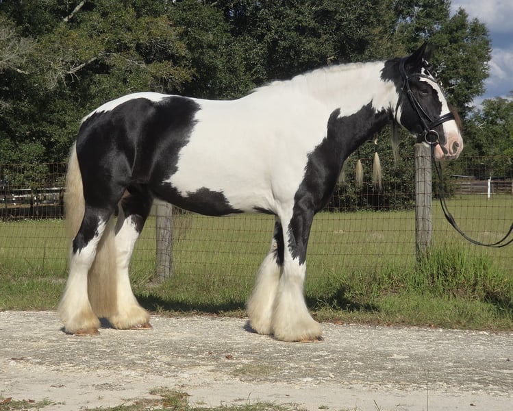 🎲𝓽𝓱𝓮 𝐑𝐈𝐃𝐄𝐑'𝐒 𝓒𝓱𝓸𝓲𝓬𝓮🎲 Happening now thru MONDAY | NOVEMBER 17th - Available EXCLUSIVELY on HorseBid's website! For more details and to register visit: www.Horsebid.com CONSIGNOR CONTACT: Show Me Sport Horses 352-467-5695 LOCATION: Ocala, FL BREED: Gypsy Vanner REGISTERED: Yes REGISTERED NAME: Sir Karryghan COLOR: Piebald HEIGHT: 15.1 AGE: 6 GENDER: Gelding Sir Karryghan 👑 Ocala, FL Offered for sale exclusively on HorseBid.com! Sir Karryghan is a stunning 6yr 15.1h Gypsy Vanner gelding registered with GVHS. He does dressage, working equitation, trail riding, trail obstacle, jumping, and cross country. He rides english and western and has one of the smoothest canters you will ever ride. Karryghan is a barn favorite! He loves attention and will greet you with a sweet knicker every day. He is a dream horse for a rider wanting a beautiful and tall Gypsy Vanner talented in many riding disciplines. Sound barefoot and up-to-date on vaccines, Coggins, floating, deworming, and hoof trimming. Please call Rachel with Show Me Sport Horses at 352-467-5695 with any questions. Shipping is available anywhere in the country.