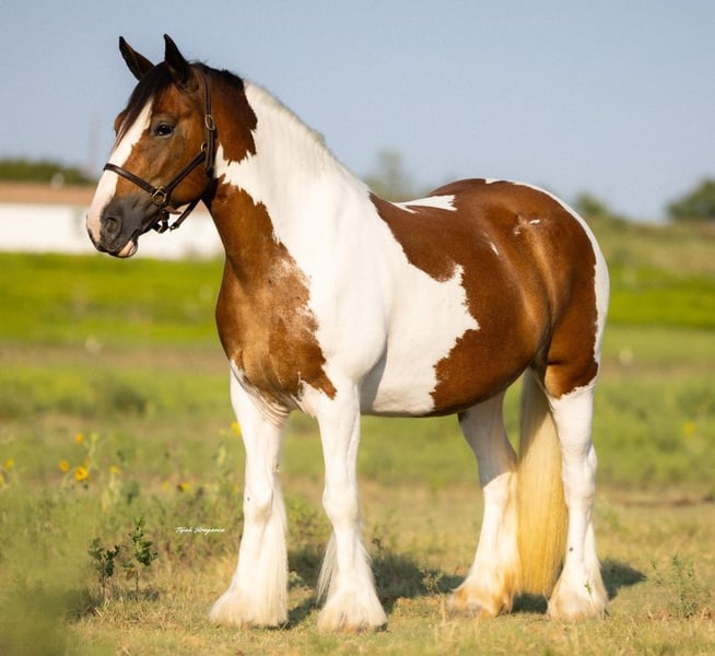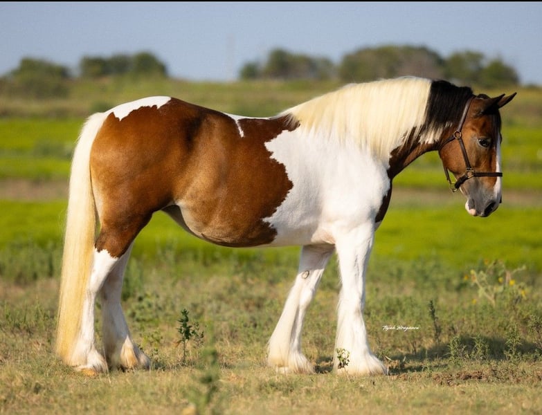 The Gypsy Horse has a distinctive and eye-catching appearance that sets it apart from other breeds. They are known for their long, flowing manes and tails, which are often kept thick and untrimmed. The feathering on their feet is also a characteristic trait of the breed, adding to their unique look. The breed comes in a variety of colors and patterns, including black and white, brown and white, and piebald, and they often have a very stocky build. Their compact size, coupled with their powerful build, makes them an ideal breed for both riding and driving.