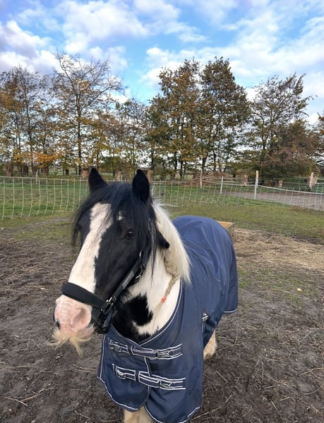 We are looking for a loving home for our Tinker pony, Rainbow, affectionately called "Tinki." Tinki is 15 years old, approximately 1.35 meters tall, and has a sturdy build that allows her to cover well. She is regularly vaccinated and dewormed, stands well for loading and farrier work, and is barefoot. At our stable, she stays in a box at night, but we can also imagine her in a paddock system. No health issues are known, and during her time with us, she has had no health problems. As is typical for her breed, Tinki occasionally develops mild mud fever, which is easily managed with regular hoof care. Feeding-wise, Tinki is uncomplicated. She mainly receives hay, along with some muesli and minerals. Tinki is an intelligent, affectionate, and lively pony that needs to be motivated, exercised, and engaged, as well as a consistent handler. She has a very friendly and loving nature but sometimes tests boundaries in a "pony manner," so she is only conditionally suitable for complete beginners. In our care, Tinki has been primarily used for pony leading, Hippolini lessons with small children, groundwork, and riding lessons. She has also shown skill and talent during pole work and small jumps. Her previous owners participated her in lead-rein competitions, and she is a reliable partner for pony rides at children's or village festivals. Tinki is being sold with bridle and saddle (included in the price). We only place her in the best hands, as she is unfortunately not mentally or physically challenged enough in our care, and we cannot meet her needs adequately. For further questions and videos, please feel free to contact us. €4,000 including saddle and bridle