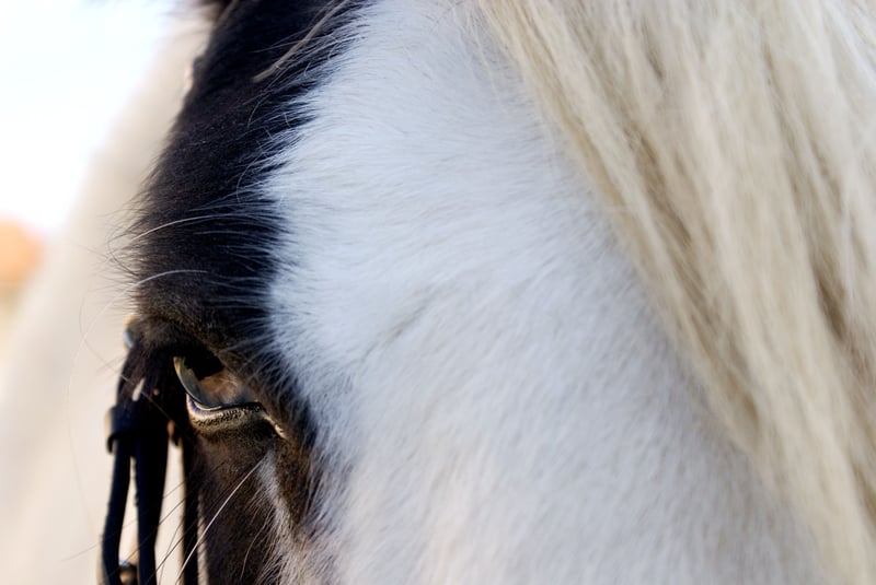 Tinker mare with a blue eye, well-behaved both on the ground and under saddle. Farrier and loading-friendly, no mud fever or scratches. She is familiar with dogs and tractors and is not spooky.