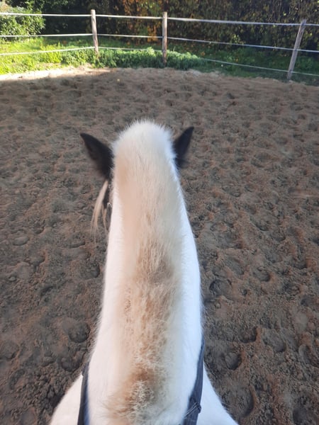 Jument Tinker avec un œil bleu, douce en manège comme à la selle, habituée à la ferrure et au chargement, sans excès de graisse ou de réhe, connaît les chiens et les tracteurs, et n'est pas peureuse.