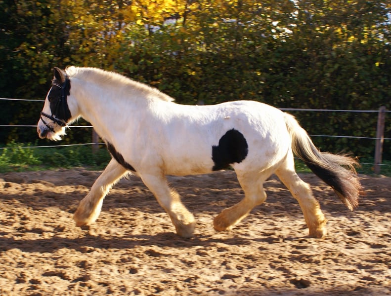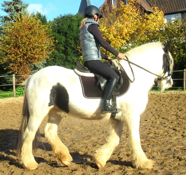 Tinkerstute mit einem blauen Auge, artig im Umgang und beim Reiten, schmiede- und verladefromm, keine Mauke oder Rehe, kennt Hunde und Traktoren, nicht schreckhaft
