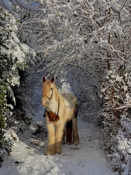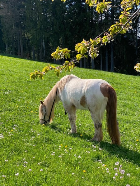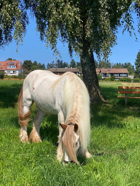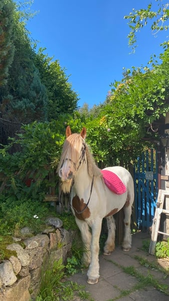 Shanti is a former breeding mare from Ireland, who has been used solely as a leisure horse for the past nine years. She is 17 years old, rideable to a limited extent, has slight arthritis, and sometimes suffers from mud fever in the autumn. Currently, she is in an open stable with another Tinker mare. Shanti is very sweet, easy to ride, and not spooky.