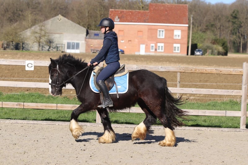 Dolly est une magnifique jument Tinker noire de 4 ans, mesurant environ 1,33 m. Elle possède une carrure élégante et pleine, ce qui en fait une véritable attraction visuelle. Au manège, Dolly est une ponette douce et calme, qui se laisse facilement manipuler. Elle connaît parfaitement les trois allures et est agréable à monter. Elle ne se cabre pas et n’accélère pas inutilement, ce qui la rend fiable sous la selle. Dolly aime également partir en promenade, seule ou en groupe, en restant toujours sage et détendue. Elle s’entend bien avec d’autres poneys. Elle aime aussi sauter. En résumé, une ponette agréable et fiable, dotée d’un tempérament en or. Plus d’informations ? 0032 475 68 22 43 Pour voir des vidéos, rendez-vous sur notre site internet.