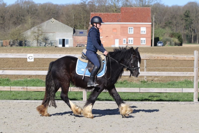 Dolly is a stunning jet-black Tinker mare, four years old and approximately 1.33 meters tall. She has a beautiful, well-built physique and is a real eye-catcher. Under saddle, Dolly is a sweet and calm pony that is easy to handle. She is well-versed in the three gaits and rides pleasantly. She will not buck or accelerate unnecessarily, making her a reliable partner under the saddle. Dolly also enjoys going on walks, both alone and in a group, remaining well-behaved and relaxed. She gets along well with other ponies and also loves to jump. In short, she is a lovely and dependable pony with a golden character. More info? +32 475 68 22 43 Videos are available on our website.