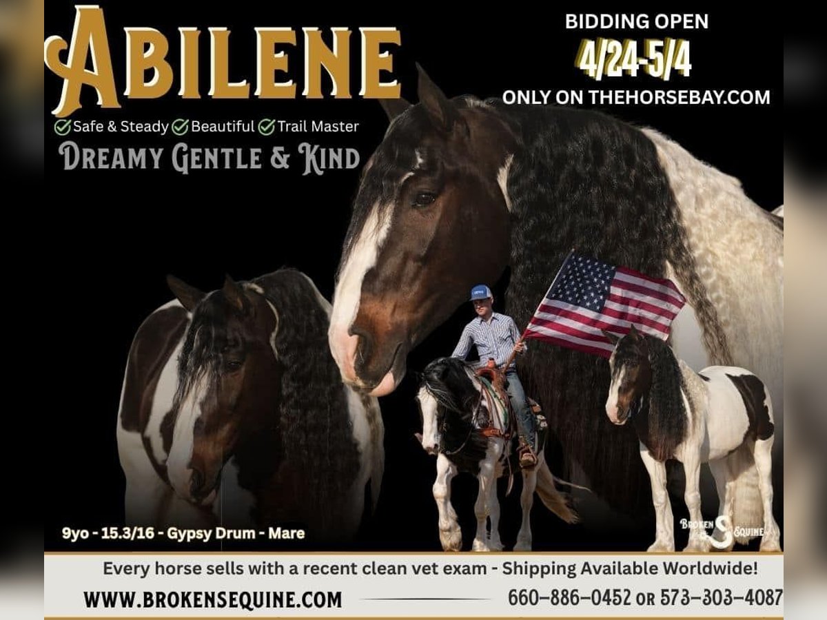 Abilene is a 9 year old Gypsy Drum mare standing 15.3/16 hands high. She is the type that catches everyone’s eye, no matter where you go. And you can go absolutely anywhere with her. She is a joy both in the saddle, and on the ground. You’ll first fall in love with her dreamy personality and lovable nature, and then when you climb into the saddle you’ll fall in love again with how safe and sturdy, she makes every ride feel. She’s a horse that every member of your family will love and enjoy for years to come. Even the non-riders in your family will want to come to the barn just to spend time with her. She is truly a love that is so gentle, kind, and sweet with everyone she meets. Abilene loves to trail ride! Whether you like a bareback stroll with a halter and lead rope, or to saddle up and go out to the mountains; Abilene is up for any adventure. She is sure footed, smart, and unbothered by the usual “spooky” things. She is safe around freight trains, tractor trailers, bikes, atvs, and more. She crosses water, climbs up banks, crosses bridges, rides around with livestock, and will go anywhere you ask her to. Animals jumping out, dogs running around, loud noises, a windy day, are nothing for her to blink an eye at. Take her out alone and feel safe or go out in a group and have the most talked about horse on the trail ride! The kids ride double with us all over, and we trust her to keep everyone safe! She’s the same sweet girl in all environments and just enjoys being out and about with her people. In the ring, Abilene is so comfortable and smooth! There aren’t many horses of her stature that ride as comfortably as she does! She will go English or western, has great brakes, and is definitely a slow and steady type. She is happy to pop over fences on hunter paces or on the cross country field too! The kids have their friends over and she is everyone’s first choice to take turns chasing calves on! She is equal parts fun, trustworthy, and steady. In the barn, Abilene is the star of the show. The second anyone steps into the barn they take one look at her and are immediately drawn to her stall. At trail rides, or in town, we have cars stop and pull over just to ask us about her. She is the center of attention and loves to be! She will stand for hours to be groomed, scratched, braided and doted on. She has impeccable ground manners and is a good girl for all of the usual barn activities. Abilene is an easy keeper that’s happy living inside or out. The best part about her is that she can be stuck in a stall for a few days or hanging out in the pasture for weeks on end and go out on a ride and be just as safe and reliable as if she’d been going every day. It is a true joy to have her in our barn. ⚫️Abilene is an easy keeper that requires no maintenance.
